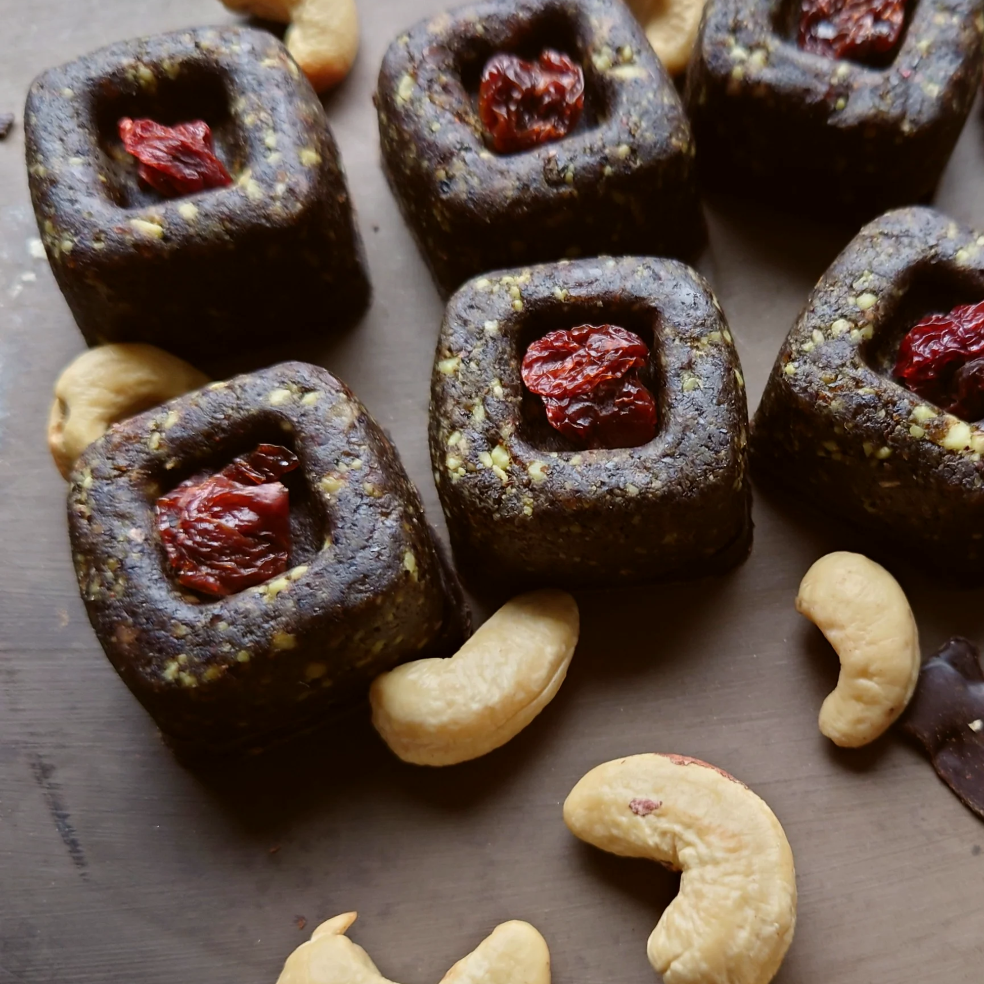 Sastāvs: Dateles, Indijas rieksti, kaņepju proteīns, karobs, kakao sviests, upeņu pulveris, ķirši, ingvera pulveris, kajenas pipari, saulespuķu lecitīns. Var saturēt citu riekstu daļiņas.